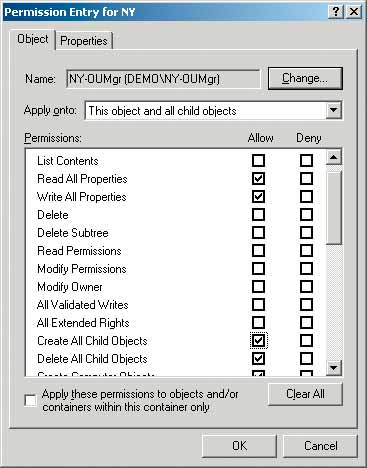 При создании каждого филиала следует формировать подразделение с названием Admin OU (группа администраторов филиала). В подразделении Admin OU для каждой роли нужно создать в домене локальную группу с префиксом из кода сайта. В приведенном примере в Нью-Йоркском подразделении Admin OU я создал группы NY-OUMgr, NY-UsrMgr и NY-CompMgr. На Экране 4 изображены эти группы и структура моего гипотетического Нью-Йоркского филиала. Подобным группам следует назначить полномочия, заранее определенные для соответствующих ролей. Например, локальная доменная группа NY-OUMgr будет иметь следующие права в рамках всего Нью-Йоркского филиала: Read All Properties («Просматривать все свойства»), Write All Properties («Записывать все свойства»), Create All Child Objects («Создавать дочерние объекты») и Delete All Child Objects («Удалять дочерние объекты»), как показано на Экране 5. Ни одно из этих полномочий не позволяет никому из членов группы менять существующие полномочия. Если я помещу учетную запись Чипа в локальную доменную группу NY-OUMgr, то он получит почти полный контроль над объектами в данном филиале и сможет предоставлять другому пользователю любое из определенных прав, просто добавляя его учетную запись в соответствующую группу. Фактически можно было бы создать локальную доменную группу под названием NY-RoleMgr и предоставить ее членам только полномочия Read Members и Write Members по отношению к групповым объектам в Нью-Йоркской группе Admin OU. В любом случае никто из членов этих групп не сможет менять централизованно установленные полномочия.
