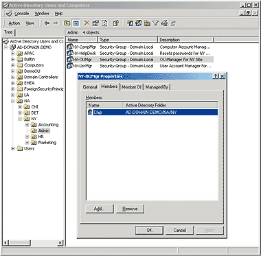 Одним из простых методов делегирования является передача администратору уровня сайта AD права полного контроля в иерархии некоторого подразделения. Например, предположим, что в домене есть два филиала, сети которых образуют разные сайты: Нью-Йорк и Детройт. Администратору по имени Чип предоставлено право полного контроля над филиалом в Нью-Йорке, а Мария получает полный контроль над филиалом в Детройте. Администраторам часто приходится перемещать учетные записи пользователя и время от времени перемещать учетные записи компьютеров и групп в другие подразделения (например, если сотрудники переезжают или меняются их должности и обязанности служащих информационных подразделений). Мария имеет право полного контроля над своим филиалом, поэтому если Джек переезжает в Нью-Йорк, то для Марии не составляет труда переместить его учетную запись за пределы своего филиала в Детройте: как у администратора уровня сайта у нее есть право удалять объекты в своем подразделении. Однако у Марии нет прав на создание объектов в филиале Нью-Йорка, поэтому она не может перемещать объекты внутрь этого филиала. Если предоставить Марии право создавать объекты в Нью-Йоркском филиале (и во всех других подразделениях, куда могут переехать пользователи из Детройта), то все имеющиеся в географически ориентированной модели администрирования преимущества системы безопасности сойдут на нет.
