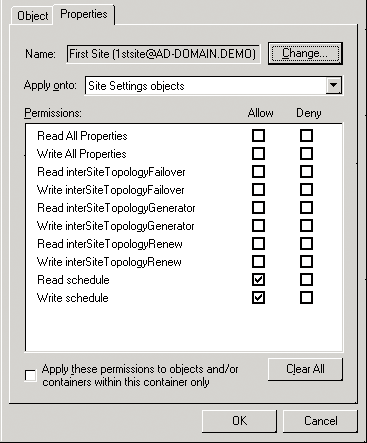 Присущая AD возможность выборочного привязывания полномочий к отдельным типам объектов позволяет широко применять делегирование ограниченных прав. Предположим, что требуется назначить группе пользователей право управлять расписанием репликации во всех сайтах предприятия. Для того чтобы это сделать, можно создать группу под названием Site Replication Schedulers («Планировщики репликации между сайтами»). Для этого нужно щелкнуть правой кнопкой мыши на контейнере Sites в оснастке Active Directory Sites and Services, в контекстном меню выбрать Properties и перейти на вкладку Security. Щелкнув по вкладкам Advanced, Add, следует ввести имя группы — Site Replication Schedulers, и в поле Apply under («Область применения») выбрать Site Settings Objects («Объекты настройки сайта»). Теперь требуется щелкнуть мышью на вкладке Properties и установить флажки Allow для свойств Read schedule («Чтение расписаний») и Write schedule («Запись расписаний»), как показано на Экране 6. Два указанных разрешения дают этой группе возможность управлять расписанием репликации на уровне сайтов на всем предприятии.