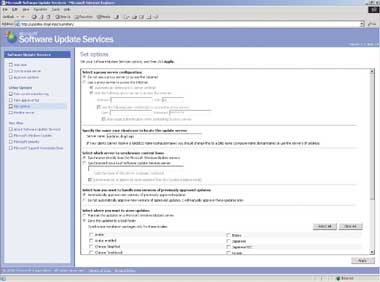 После настройки можно перейти к конфигурации сервера через административный Web-интерфейс, указав в качестве адреса http://SUSserver/SusAdmin. Изменение основных параметров производится из окна Set options (см. Экран 2).