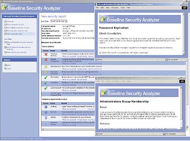 Утилита MBSA сходна по функциональности с Hfnetchk, но, в отличие от нее, использует графический интерфейс и позволяет находить основные ошибки в настройке системы безопасности. В процессе работы генерируются подробные отчеты, которые сохраняются для дальнейшего анализа. Из отчетов администратор получает информацию о методике тестирования и рекомендации по устранению неполадок (см. Экран 1).