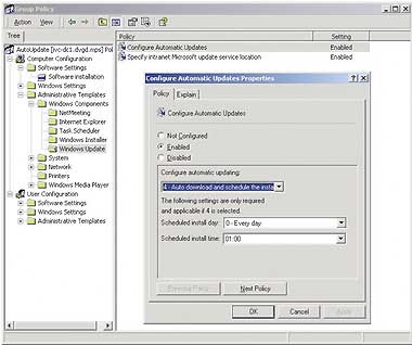 Настроить политики Automatic Updates Client (Administrative Templates-> Windows Components-> Windows Updates). В настройках определяется способ и время обновления (см. Экран 5), тип сервера — локальный SUS или Microsoft Windows Updates (см. Экран 6).
