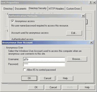 Теперь реализуем более полную версию программы сжатия для asp-страниц. В первую очередь нужно позаботиться о том, чтобы можно было вызывать из ASP компонент WScript.Shell и выполнять с его помощью вызов gZip. Для этого c помощью приложения Computer Management необходимо создать учетную запись для нового пользователя, которую затем указать в консоли Internet Information Services как учетную запись анонимного пользователя, на закладке Directory Security для нашего приложения, созданного в IIS (см. Экран 2).