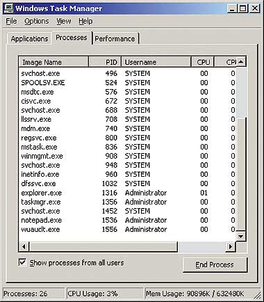 В каждый момент времени на типичной системе Windows 2000 выполняется множество процессов. Открыв Task Manager и выбрав закладку Processes, можно увидеть список одновременно выполняемых процессов. Дополнительную информацию о каждом процессе можно получить, открыв меню View и выбрав пункт Columns. Установив флажок User Name и щелкнув на кнопке OK, можно увидеть список, аналогичный приведенному на Экране 1, где перечислены владельцы каждого процесса.