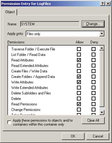 Учетной записи System следует предоставить право создавать файлы и каталоги, но не изменять существующие файлы. Для этого нужно установить два параметра ACL для каталога Log-Files — один для подкаталогов (контейнеров) и один для файлов (объектов).