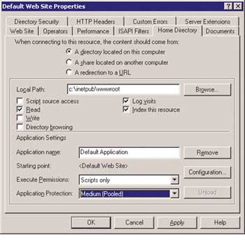 О. Проблема заключается в различиях между принимаемыми по умолчанию мерами защиты приложения и параметрами изоляции в Internet Information Services (IIS) 5.0 и в IIS 4.0. Эти параметры определяют способ выполнения приложений на сервере. Приложения могут работать в том же процессе, что и Web-сервер (режим Low), в отдельном объединенном процессе с другими приложениями (режим Medium) или в изолированном отдельном процессе (режим High). Эти режимы можно настроить на закладке Home Directory диалогового окна Web Site Properties системы IIS (см. Экран 1).