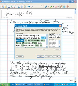 Программа Windows Journal прекрасно подходит для заметок, однако извлекать из нее текст порой бывает очень сложно. Windows Journal может сохранять текст только в своем уникальном формате .jbt. Для того чтобы считать текст, пользователь должен выделить интересующий фрагмент (не более страницы за раз) и выбрать в меню Edit пункт Copy as Text. На экране появится диалоговое окно, в котором отображается написанный пользователем текст, как его понимает Windows Journal. Слова, в которых программа не уверена, подсвечиваются. На данном этапе пользователь может вносить в текст исправления. Чтобы поместить фрагмент в буфер обмена Windows, нужно щелкнуть на пункте меню Copy. После этого текст можно вставить в любую Windows-программу и начать процесс форматирования (а он может быть исключительно длительным, если текста набирается больше, чем на один абзац).