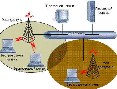 Инфраструктура типичной беспроводной сети состоит из нескольких узлов доступа. Эти узлы соединены с сетью с помощью проводов и образуют скрытый от глаз пользователей мост для беспроводных клиентов. Беспроводные клиенты — это клиентские устройства (скажем, портативные компьютеры, настольные системы или карманные компьютеры). Они оснащаются совместимыми платами для беспроводного доступа и используют для обмена информацией радиопротоколы и заданную частоту. Как правило, узлы доступа обеспечивают автоматическое соединение беспроводного устройства с проводной сетью. Когда беспроводной клиент соединяется с узлом доступа и проходит аутентификацию, он может направить запрос на получение IP-адреса и обращаться к сетевым ресурсам.