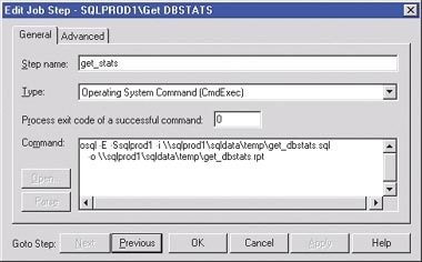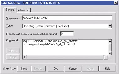В задании Get DBSTATS SQL Server Agent прослеживается два шага. На первом, показанном на Экране 3, используется команда osql для запуска хранимой процедуры usp_get_dbstats. Использование osql на втором шаге выводит результаты работы usp_get_dbstats в файл для дальнейшего исполнения. Переключатель -о сообщает usp_get_dbstats о необходимости записать вывод в файл c: empget_dbstats.sql. Этот файл представляет собой сценарий T-SQL, который и будет выполняться в задании SQL Server Agent.