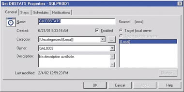 Хранимую процедуру usp_get_dbstats можно запустить вручную, сгенерировать сценарий T-SQL, скопировать код сценария в Query Analyzer и получить текущую статистику из таблицы DBSTATS. Однако такой подход отнимает очень много времени в реальной ситуации с большим числом баз. Вместо этого следует воспользоваться помощью SQL Server Agent, как показано в примере Get DBSTATS на Экране 2.