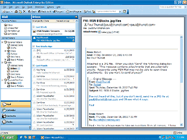 Версия Outlook 11 включает и множество других улучшений. В предыдущих версиях вызвавшая нарекания функция Address AutoComplete постоянно навязывала ненужных адресатов. В новой версии сначала предлагаются часто используемые электронные адреса. В Outlook 11 предусмотрена вертикальная компоновка потоков сообщений и ответных сообщений и не используется ступенчатая компоновка, из-за которой ранее правая часть сообщения нередко пропадала из поля зрения. На странице Calendar пользователь может загружать календари других пользователей рядом со своим календарем для визуального сравнения. Кроме того, в Outlook 11 возможен просмотр в режиме «только для чтения» календарей, контактной информации и фотографий, опубликованных на Web-сайте, построенном с помощью Microsoft SharePoint Team Services.Некоторые нововведения невооруженным взглядом не видны. Новый режим кэширования предполагает автоматическое создание локальных копий почтовых ящиков, папок общего доступа Public Folders и папок предпочтений Favorites, что повышает эффективность работы соединений с низкой пропускной способностью в автономном режиме. Эффективность еще больше повышается при подключении клиента Outlook 11 к серверу Titanium. Как утверждают в Microsoft, совместное использование этих двух продуктов уменьшит сетевой трафик на 50-70%.