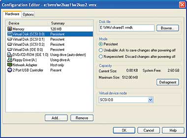 Для приготовления изысканного блюда мало иметь под рукой необходимые ингредиенты, нужно знать, в каком порядке их соединять. Итак, порядок построения виртуального кластера. Для начала следует запустить на системе два экземпляра Windows Advanced Server в качестве виртуальных машин. Для данной статьи я построил виртуальный кластер на компьютере Dell Inspiron 8100 с процессором на 1 ГГц и оперативной памятью 512 Мбайт. Роль главной операционной системы выполняла Windows XP Professional Edition. Виртуальные машины были организованы с помощью VMware Workstation 3.2. Эти инструменты позволяют успешно продемонстрировать процедуры установки и конфигурирования серверных кластеров как Exchange 2000, так и SQL Server 2000.Чтобы построить две виртуальные машины Windows 2000 Advanced Server, следует создать, установить и настроить первую виртуальную машину (VM1) в качестве автономного сервера Windows 2000 AS. После завершения установки нужно выключить VM1 и скопировать данные из папки VM1 на хост-машине в папку с именем VM2 (или любым другим). Затем следует открыть VM2 в консоли VMware. Открыв редактор Configuration Editor for VM2, необходимо перейти к вкладке Options и дать VM уникальное имя. Далее на вкладке Hardware требуется изменить путь к файлу виртуального диска VM2, чтобы он указывал на файл виртуального диска в папке VM2. После завершения конфигурирования следует загрузить VM2 и изменить ее хост-имя и IP-адрес, чтобы они отличались от имени и адреса VM1 (обычно я использую такие имена, как Node1 и Node2). Благодаря этому приему подготовка второго функционирующего сервера занимает значительно меньше времени, чем полная установка Windows 2000 AS на второй VM.