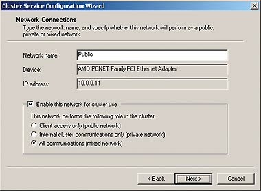 - Ввести имя сети и установить флажок Enable this network for cluster use (см. Экран 3). Данная VM располагает лишь одной виртуальной сетевой платой, поэтому я выбрал режим All communications (mixed network) и щелкнул Next. При наличии двух виртуальных сетевых плат можно организовать общедоступную и частную сети.