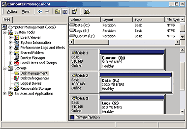 - Теперь все три диска имеют сигнатуры, и нужно создать на каждом диске раздел в формате NTFS. Для этого необходимо щелкнуть правой кнопкой мыши на неиспользуемом пространстве диска и выбрать пункт Create Partition. Я присвоил первому тому имя Quorum и символ Q, второму тому — имя Data и символ R, а третьему тому имя Logs и символ S. На Экране 2 показаны три отформатированных диска в папке Disk Management.