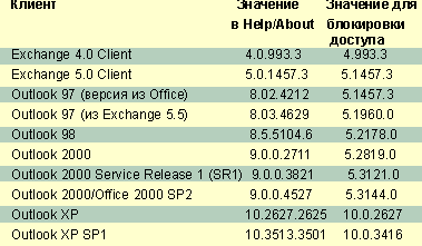 Можно разместить знак дефиса (-) перед значением параметра реестра, чтобы блокировать всех клиентов более ранних версий. Например, использование-5.3143.0 заблокирует доступ клиентов, имеющих версию меньше, чем Microsoft Outlook 2000 SP2 (т. е. 5.3144.0). Аналогично можно поместить дефис после значения реестра для блокировки более поздних версий. Скажем, запись 10.0.3147- будет блокировать доступ клиентов старше Outlook XP SP1 (т. е. 10.0.3416).