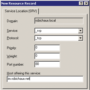 В результате этих действий формируется виртуальный IM-сервер, но для него необходимо создать запись SRV на сервере DNS, чтобы клиенты могли отыскать виртуальный сервер IM посредством DNS. Это довольно просто сделать с помощью оснастки DNS в MMC.