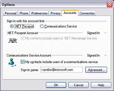 - установить флажок My contacts include users of a communications service. В поле Sign-in name нужно ввести имя для обращения к IM-серверу;