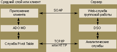 Analysis Services имеет три программных интерфейса, которые могут использоваться в среде аналитического приложения. Первые два интерфейса — ADO MD и OLE DB For OLAP — размещаются на стороне клиента. Оба они предоставляют клиенту функции для исследования данных и метаданных, алгоритм обратной записи и аналитические функции (в режиме read-only). Повлиять на содержимое куба, с которым сообща работают пользователи системы, можно только через механизм Write-Back. Если необходимо изменять данные Analysis Services каким-то иным способом, следует задействовать административный программный интерфейс Decision Support Objects (DSO). DSO позволяет создавать и изменять кубы, размерности, вычисляемые ячейки, а также использовать иные функции для интерактивного взаимодействия через приложение Analysis Manager.