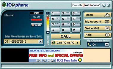 Оборудование YapGear компании Net2Phone может использовать адресную книгу «Yahoo! Address Book» (http://address.yahoo.com). Эта функция всегда пригодится, если пользователь работает в режиме автоматического соединения, имея только одну доступную линию, поскольку звонить через компьютер можно по той же линии, по которой осуществляется выход в Internet. Следует щелкнуть по телефонному номеру в адресной книге «Yahoo! Address Book», после чего загрузится апплет Net2Phone, и по выбранному номеру можно будет позвонить.Еще одна программа, позволяющая звонить с одного компьютера на другой, — ICQphone Internet messaging компании ICQ (http://www.icq.com/icqphone). ICQphone определяет наличие программы Internet-телефонии и выводит маленький желтый значок телефона рядом с именем каждого пользователя, имеющего оборудование для Internet-телефонии. Чтобы сделать звонок с компьютера на компьютер, нужно выбрать имя из списка ICQ Contact List, выбрать ICQphone в пользовательском меню, затем щелкнуть Send PC-to-PC Call. Откроется диалоговое окно Send Online PC to PC Call Request. По желанию в этом окне можно указать причину звонка. Нажимаем Send. После того как абонент примет вызов, откроется окно ICQphone (см. Экран Б) со значками, напоминающими телефонную сенсорную панель (громкость звука и ряд других настроек).