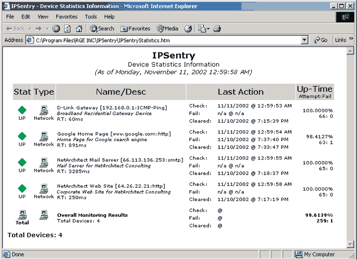 Экран 1. Использование IPSentry для мониторинга доступности устройств.