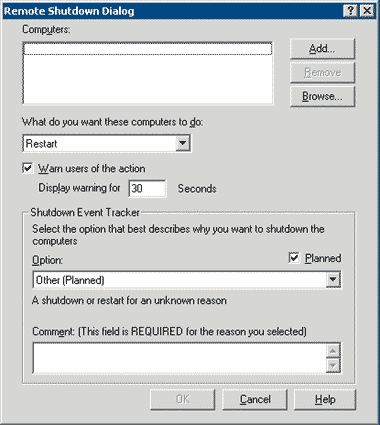 Усовершенствованный графический интерфейс, показанный на Экране 5, позволяет выключать несколько компьютеров одной командой и указать причину отключения или перезагрузки компьютеров. Графический интерфейс Shutdown вызывается командой