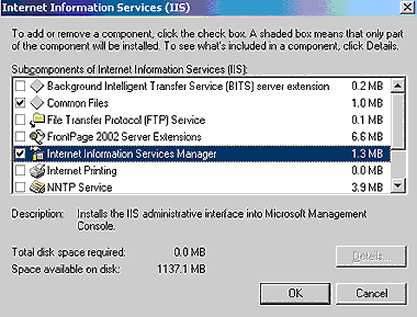 Более интересный метод — использование утилиты Add/Remove Windows Components. Если выбрать Application Server и щелкнуть на кнопке Details, то утилита Add/Remove Windows Components отображает список компонентов, в который входят Internet Information Services и несколько элементов, отсутствовавших в предыдущих версиях утилиты. В Таблице 1 приведены сравнительные данные о Web-компонентах IIS 6.0 и IIS 5.0. Если установить IIS 6.0 с помощью этой утилиты, то в результате будет построен Web-сервер, который предоставляет только статический контент (если в процессе установки не были активированы приложения с определенными расширениями). Если выбрать IIS и щелкнуть на кнопке Details, то будут показаны элементы IIS 6.0 (см. Экран 2).