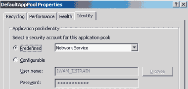 Мы познакомились с ключевыми архитектурными компонентами IIS 6.0, и настало время рассказать о возможностях пулов приложений. В диалоговом окне Properties пула приложений имеется четыре вкладки — Recycling, Performance, Health и Identity (см. Экран 5). Вероятно, самая важная из них — вкладка Recycling. Из нее можно управлять циклом пула приложений (останавливать или запускать) с помощью W3SVC, в зависимости от времени (в минутах), прошедшего после запуска процесса, числа запросов get, времени суток или размера занятой памяти. По умолчанию цикл пула приложений составляет 1740 мин (29 ч).