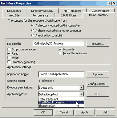 Нередко упоминают и о пулах приложений (application pools) IIS 6.0. Пул приложений — именованный исполнительный процесс (или группа процессов). В IIS 5.0 можно назначить низкий (Low — IIS Process), средний — объединенный (Medium — Pooled) или высокий — изолированный (High — Isolated) — уровень защиты приложений. Эти меры полезны, но что делать, если нужно запустить два приложения в одном пуле (экземпляр dllhost.exe) и два приложения в другом пуле (другой экземпляр dllhost.exe)? В IIS 5.0 нет способа присвоить имена экземплярам dllhost.exe и связать приложения с назначенными именами. Благодаря пулам приложений IIS 6.0, администратор может дать исполнительному процессу имя (см. Экран 6) и связать Web-узлы или каталоги с этим пулом (см. Экран 7).