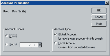 Последняя политика, касающаяся регистрации и применяемая в отношении отдельных пользователей, связана с датой окончания срока действия учетной записи. По умолчанию срок действия пользовательских учетных записей не ограничен. Можно установить дату окончания срока действия учетной записи, щелкнув Account в диалоговом окне New User и указав дату в окне Account Information (см. Экран 4). Установление срока действия учетной записи оправдано для сотрудников, работающих по временному контракту, или когда заранее известно, что пользователь покинет компанию. Администратор просто заранее устанавливает определенную дату, после чего NT берет заботу об этой учетной записи на себя. Я знаю администраторов, которые использовали данную функцию, имея хронические проблемы, связанные с тем, что их не предупреждали о времени ухода сотрудников из компании. Ответственные администраторы устанавливали предел в 30 дней для каждого пользователя и требовали от отдела кадров ежемесячного отчета со списком действительно работающих сотрудников. На основе поданных списков администраторы продлевали срок действия учетных записей. В результате, если кто-то увольняется, а администратора не ставят об этом в известность, NT автоматически закрывает учетную запись через 30 дней.