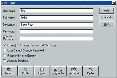 Индивидуальные политики «пересиливают» глобальные политики для данной пользовательской учетной записи. Каждая пользовательская учетная запись имеет несколько параметров, которые влияют на способность пользователя регистрироваться в системе. Администраторы и операторы учетных записей могут редактировать эти параметры, выполнив двойной щелчок по учетной записи пользователя в User Manager for Domains. На Экране 2 показано диалоговое окно New User, которое при этом появляется.