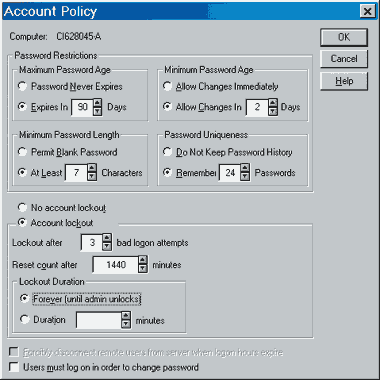 Настройка параметров Password Restrictions в диалоговом окне Account Policy позволит приучить пользователей к наиболее эффективным методам управления паролями. Настройка парольных ограничений важна потому, что пользователи, как правило, относятся к паролям легкомысленно. Защита паролей осуществляется тремя способами: необходимо требовать от пользователей создания трудно угадываемых паролей, регулярной смены паролей и настраивать политики блокировки учетных записей.