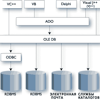 На Рисунке 6 показано несколько способов, с помощью которых приложение связывается с базой данных. Например, VB-программист может использовать ADO для соединения приложения с провайдером OLE DB. Если база данных не поддерживает OLE DB, приложение может задействовать ODBC. Программист на Visual C++ может применять ADO или соединяться напрямую через OLE DB.