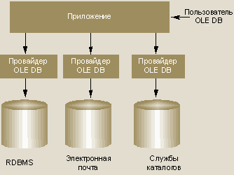 Рассмотрим OLE DB. Технология OLE DB построена на ODBC и расширяет ее до компонентной архитектуры, которая обеспечивает высокоуровневый интерфейс доступа к данным. Эта архитектура предоставляет постоянный доступ к SQL-данным, не SQL-данным и неструктурированным источникам данных по локальным сетям и Internet. В действительности для доступа к SQL-данным OLE DB использует ODBC, потому что это самая подходящая архитектура для работы с SQL. На Рисунке 5 показано, что OLE DB состоит из трех компонентов: потребителя данных (например, приложения); поставщика (провайдера) данных, который содержит и предоставляет данные; служебного компонента, который обрабатывает и транспортирует данные (в частности, процессоры запросов, процессоры курсоров). OLE DB — это единый API, который обрабатывает как совместимые с SQL источники данных, так и несовместимые, такие, как почта и каталоги.