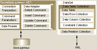 | DataAdapter | Объект, соединяющий базу данных с объектом DataSet. Основное преимущество DataAdapter состоит в том, что он может работать с любыми источниками данных. Источник данных может быть как базой данных, так и XML-документом. |