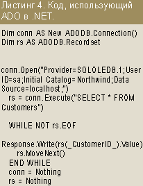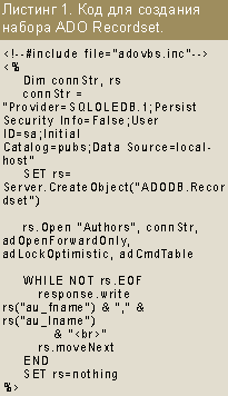 Рассмотрим простой пример работы ADO. В Листинге 1 показано, как можно использовать типичный объект — набор строк (Recordset) — центральный объект в ADO. Объект Recordset представляет собой набор записей (таблицу) и поддерживает типы курсоров adOpenForwardOnly, adOpenKeyset, adOpenDynamic и adOpenStatic. Курсор может быть как на стороне сервера (по умолчанию), так и на стороне клиента.