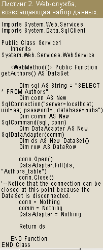 Рассмотрим, как ADO.NET действует в Web-службе. В Листинге 2 показана Web-служба, которая возвращает объект Data Set. Код в Листинге 2 похож на код в Листинге 1. Web-служба в Листинге 2 отыскивает таблицу Authors в базе Pubs и представляет ее как Web-службу. Web-служба использует поставщик данных SQL Server .NET, как показано в следующей строке: