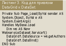 В Листинге 3 показан код, выполняющий данную привязку. На Экране 2 изображен результирующий DataSet, привязанный к элементу управления DataGrid в Web-приложении на ASP.NET, которое представит этот DataSet в более удобном виде. ASP.NET поддерживает много элементов управления, которые привязываются к DataSet автоматически.