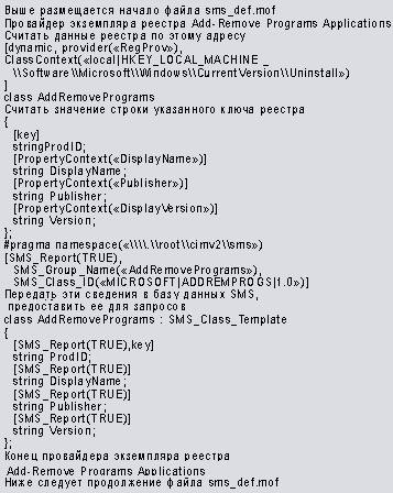 Рассмотрим теперь вопрос о том, как расширить функциональные возможности SMS 2.0 с помощью информации, считываемой из реестра клиентов SMS. Возможности инвентаризации аппаратных и программных средств SMS можно расширить путем редактирования некоторых файлов первичного узла. Рассмотрим два примера. В одном речь идет о данных, хранящихся в разделе реестра Add/Remove Programs, а в другом — об информации раздела Custom Registry Key Software Update. В обоих случаях данные считываются из разделов реестра и передаются в базу данных SMS.
