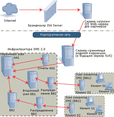 Данная конфигурация обеспечивает дополнительный уровень защиты, поскольку сервер загрузки выступает в роли хранилища модулей коррекции и располагается за корпоративным брандмауэром. Если этот сервер построен на базе надежного и мощного оборудования, позднее на нем можно будет установить пакет SUS Feature Pack с тем, чтобы продолжать модернизацию клиентов SMS с помощью стандартных модулей коррекции для системы безопасности. Сервер загрузки может также публиковать Web-отчеты SMS для компаний-партнеров так, чтобы информация оставалась при этом под защитой брандмауэра.