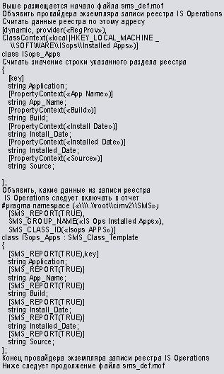 Мы проследили за всеми этапами обновления реестра по каждому пакету SMS, который был установлен на наших клиентских компьютерах. А может быть, есть смысл еще раз отредактировать файл sms_def.mof так, чтобы средства SMS могли включать эти сведения в свои отчеты? Данная процедура напоминает процесс редактирования файла управляемых объектов для включения в отчеты данных из раздела реестра Add/Remove Programs. В Листинге 2 указаны изменения, которые необходимо внести для того, чтобы в отчеты включались данные об установленных пакетах SMS. Желающие могут добавить этот сценарий в файл sms_def.mof в своей тестовой лаборатории.