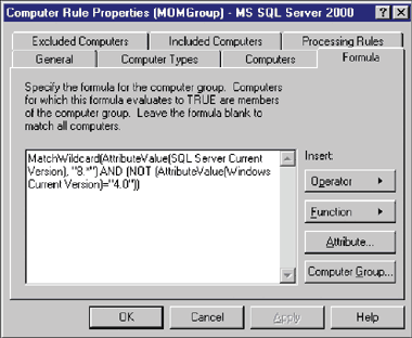 В MOM используются формулы компьютерных групп (computer group formulas), служащие для разбиения компьютеров по функциональным категориям (например, компьютеры с SQL Server). Объединение компьютеров в функциональные группы позволяет применять правила обработки по функциональному признаку сразу для всех компьютеров, входящих в состав той или иной группы. Формулы, которыми оперирует MOM, основываются на атрибутах компьютера; управляющие пакеты MOM (и базовый пакет, и пакет приложения) устанавливают большинство таких формул и атрибутов.