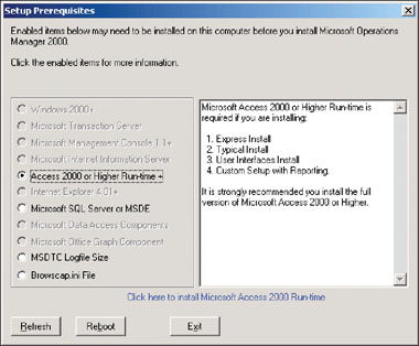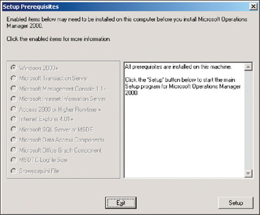 MOM предоставляет интерфейс, с помощью которого можно установить, соблюдены ли все предварительные условия для установки программного обеспечения комплексной системы мониторинга. При установке MOM с компакт-диска запускается программа Setup, и на экране появляется стартовое меню MOM. Следует выбрать вариант Setup Prerequisites, чтобы ознакомиться со списком необходимого программного обеспечения. На Экране 1 показано, что Setup обнаружила на станции следующие программы: Windows 2000 (или более позднюю версию), Microsoft Transaction Server (MTS), Microsoft Management Console (MMC) 1.1 (или более позднюю версию), Microsoft IIS, Microsoft Internet Explorer (IE) 4.01 (или более позднюю версию), Microsoft Data Access Components (MDAC) и Microsoft Office Graph Component. Перед установкой MOM нужно инсталлировать все оставшиеся программные компоненты. Некоторые из них можно установить, не выходя из режима Setup Prerequisites, например, такие, как Microsoft Access 2000 Runtime (или более позднюю версию), Microsoft Distributed Transaction Coordinator (MS DTC) и файл browscap.ini. Остальные компоненты — Microsoft SQL Server, Windows 2000 (или более позднюю версию, если она еще не установлена) — можно поставить только отдельно, для этого из программы Setup Prerequisites придется выйти.