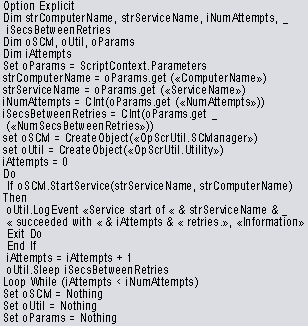 В Листинге 1 представлен простой сценарий запуска произвольной службы на компьютере. Интерфейс сценариев MOM позволяет передавать в программу параметры, что еще больше увеличивает его гибкость. Пользователь при вызове данного сценария указывает имя компьютера, название службы, число попыток и число секунд ожидания между попытками.
