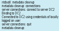 Мы были готовы погрузиться в бездну базы данных AD. Для очистки «осиротевшей» записи базы данных было решено использовать утилиту Ntdsutil, мощный инструмент командной строки, в составе которой есть множество команд для работы с базой данных AD. Для удаления «осиротевшей» записи следует применить команду Metadata cleanup. Более подробные сведения об утилите Ntdsutil и ее командах можно найти, обратившись по адресу: http://www.microsoft.com/windows2000/techinfo/ reskit/en-us/default.asp, и выбрав пункты Distributed Systems Guide, Appendixes и Active Directory Diagnostic Tool (Ntdsutil.exe).