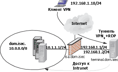 Рассмотрим пример практической реализации подобного решения. Корпоративная сеть, построенная на основе службы каталогов Active Directory, использует диапазон адресов 10.0.0.0/8 и пространство имен dom.isec. Для доступа к Internet используется Microsoft ISA Server с адресом внутреннего интерфейса 10.1.1.1/24. В сети имеется ряд контроллеров домена, один (или несколько) из которых выделяется для обслуживания запросов терминальных серверов. Хотя бы один из этих серверов должен исполнять роль сервера глобального каталога (Global Catalog, GC). В рассматриваемом примере для такой цели выделен один сервер с адресом 10.1.1.2/24 и FQDN dc.dom.isec (см. Рисунок 1).
