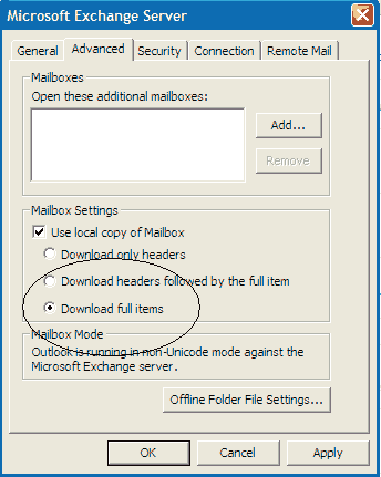 Для того чтобы установить локальный кэш, необходимо изменить свой профиль Exchange и использовать локальную копию почтового ящика, как показано на Экране 2. По умолчанию Outlook сначала загружает заголовки сообщений, а затем и полное их содержимое в локальный кэш. Требуется установить дополнительные свойства своего почтового ящика таким образом, чтобы Outlook загружал только заголовки сообщений (снижая тем самым сетевой трафик) или же немедленно загружал все сообщение целиком (см. Экран 3).