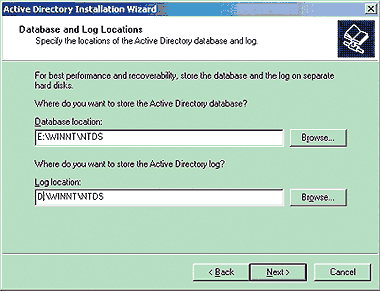 | Экран 1. Указание размещения базы данных AD и файлов журналов. |
