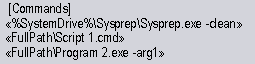 Можно достичь еще более высокого уровня гибкости в развертывании систем на базе образов за счет автоматического исполнения команд в процессе или после выполнения Mini-Setup. Для установки и запуска программ, исполнения пакетных файлов и сценариев после того, как завершается процесс установки Mini-Setup, создаются записи в специальном файле с именем cmdlines.txt. Если нужно установить программы или выполнить команды, сценарии, программы или пакетные файлы после перезагрузки целевой системы, записи создаются в секции GuiRunOnce файла sysprep.inf.