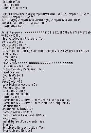 Файл Sysprep.inf содержит еще несколько элементов, которые помогают рационализировать процесс работы с образом и сделать его более эффективным. Секция UserData позволяет заранее дать ответы на типичные вопросы, задаваемые в процессе установки. Представьте, сколько можно сэкономить времени на одном только серийном номере продукта, если не придется каждый раз вводить его вручную. Можно оставить пустыми значения тех параметров, которые желательно вводить вручную в процессе выполнения Mini-Setup. Если необходимо, чтобы образ совместно использовался многопроцессорными и однопроцессорными компьютерами, можно это сделать, указав в секции Unattended параметры UpdateHAL или UpdateUPHAL. Секция Identification позволяет автоматизировать процесс объединения доменов или рабочих групп. Если посмотреть на образец файла Sysprep.inf, можно заметить, что значения настроек DomainAdmin и DomainAdmin