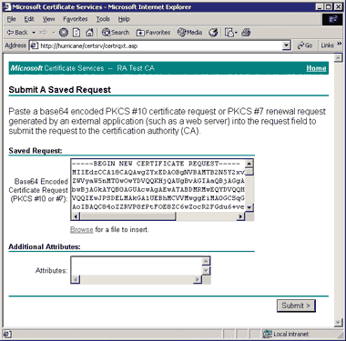 - На странице Submit A Saved Request, представленной на Экране 3, показано, откуда берется подготовленный для обработки запрос. С помощью Notepad нужно открыть файл PKCS #10 на компьютере, с которого была запущена программа браузера. Необходимо скопировать содержимое файла и вставить его в текстовый блок Saved Request. Если сервер сертификации в настройках системы указан как надежный узел, можно воспользоваться ссылкой Browse для поиска и выгрузки файла запроса. Следует щелкнуть Submit, и система отошлет запрос в CA для обработки.